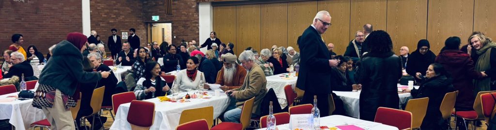 Nearly 150 guests were hosted at the International Convention Centre Wales in Newport for an interfaith evening of celebration of Unity and Peace on 7th March 2024. At the invitation of the High Sheriff of Gwent, Prof. Simon Gibson, CBE, DL, to the Interfaith Council of Wales to hold the event, including a delicious buffet, in the beautiful Woodland Suite, members of the Interfaith Council considered how they might best reach out to people who may never have experienced such a meeting before.